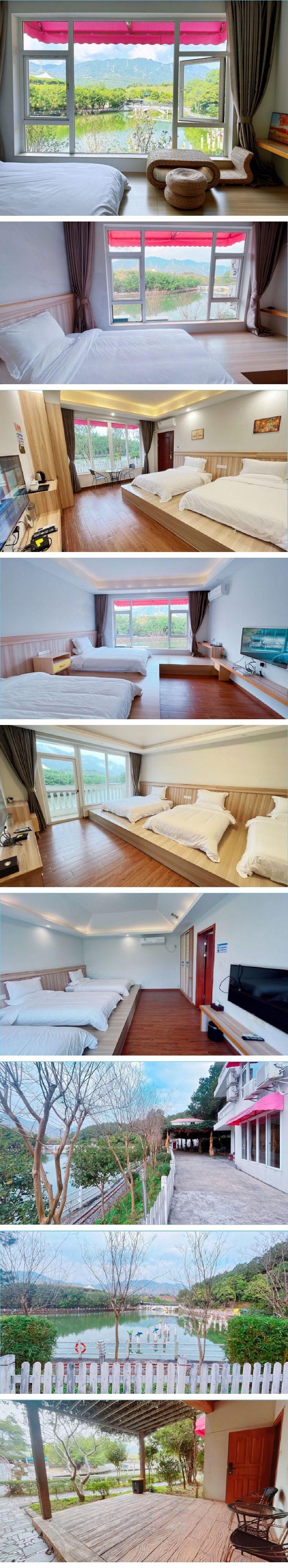 複(fù)古湖(hú)景房,房型包括:一(yī)房一廳(帶(dài)陽台),兩房一廳(帶陽台(tái)/花園)!一樓房間帶花園(yuán),二樓和三樓房(fáng)間帶陽台。所(suǒ)有房間均依山望湖(hú),還是一線望湖哦!入住期(qī)間可以隨時免費到景區遊覽。