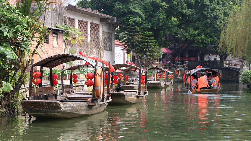 逢(féng)簡水鄉 位於順德杏壇鎮,被譽為“廣(guǎng)東的周莊”,周莊雖美,但(dàn)有點脂粉(fěn)氣,而逢簡則是素淨清純(chún)的美女,讓人不敢褻瀆。廣(guǎng)東逢簡村榮(róng)獲2013中國(guó)最美村鎮”的“典(diǎn)範(fàn)獎”。水鄉水文資源極佳,繞村居水道逾10公裏,轄(xiá)區水道達28公裏之(zhī)多。遊人泛(fàn)舟蕩漾碧波之中,大有曲折迂回無窮無盡之感。水鄉至今遠離都市喧囂,空氣清新宜人,與嶺南古(gǔ)村格局相輔相(xiàng)成。而兩岸古屋古(gǔ)樹交錯(cuò)分布,石板街道縱橫,通常隻有(yǒu)村民三三兩兩經過,大有陶淵明詩句中“野(yě)外罕人事,窮巷寡輪鞅。白日掩荊扉,虛室絕塵想”的意(yì)境(jìng)。