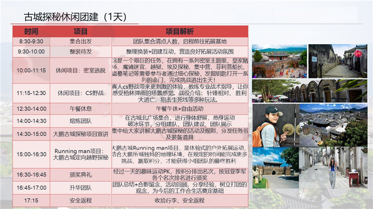 超級自拍:根據任務書找到實景完成團隊創意自拍;古城尋寶:根據提示卡推理出古城寶藏的位置,並找到寶藏;