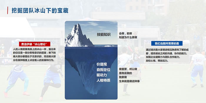 集合,強調團隊紀律及要求 運動覺醒課程,設立團(tuán)隊挑戰,隊長帶領完成挑戰 穿戴頭盔及護甲,進行TACKLE ( TACKLE=勇氣(qì))訓練(liàn),學習自我保護,對抗(kàng)練習 球隊戰(zhàn)術演習,自我認知(zhī)及分析、對手認知及分析,收集建(jiàn)議、確定戰術 冠軍賽入場儀式(shì),公示獎懲條件 |