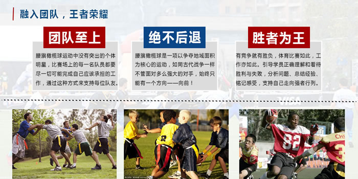 穿(chuān)戴頭盔,初步接觸專業裝(zhuāng)備,講解安全注意事項 QB、RB、WR、DB訓(xùn)練( QB=責任、RB=堅韌、 WR=專注、DB=應變),腰旗橄欖球(qiú)位 置(zhì)及技術初步學習,在(zài)過(guò)程中設立不同程度的挑戰 訓(xùn)練總結,灌輸團隊概念(niàn) |