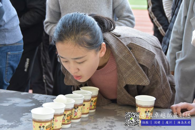 5個紙杯中裝滿水挨著放好,氣(qì)球(qiú)放在第一個杯子上,成員隻能用嘴吹的狀態下,從第一個吹到最後一個杯子裏麵。
