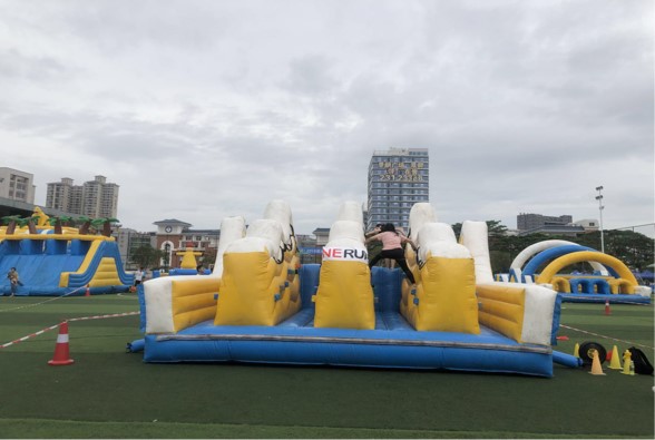 2人同時進行衝關(guān);利用兩(liǎng)邊(biān)的小岩點,通過約5米的(de)岩壁,再來一個小型(xíng)滑滑梯,即成功通關。