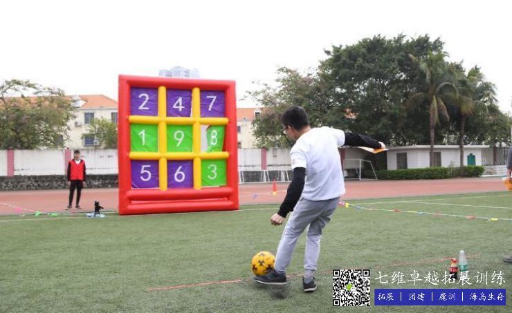【比賽方法】1、比賽開始(shǐ),參(cān)賽隊員排列在起點射中9宮格足球上麵的數字,每隊選(xuǎn)手射中數字相加則為總成績,數字越高成(chéng)績越好。