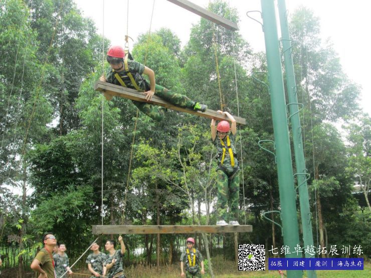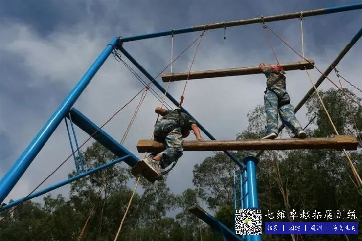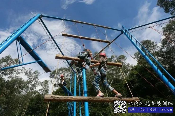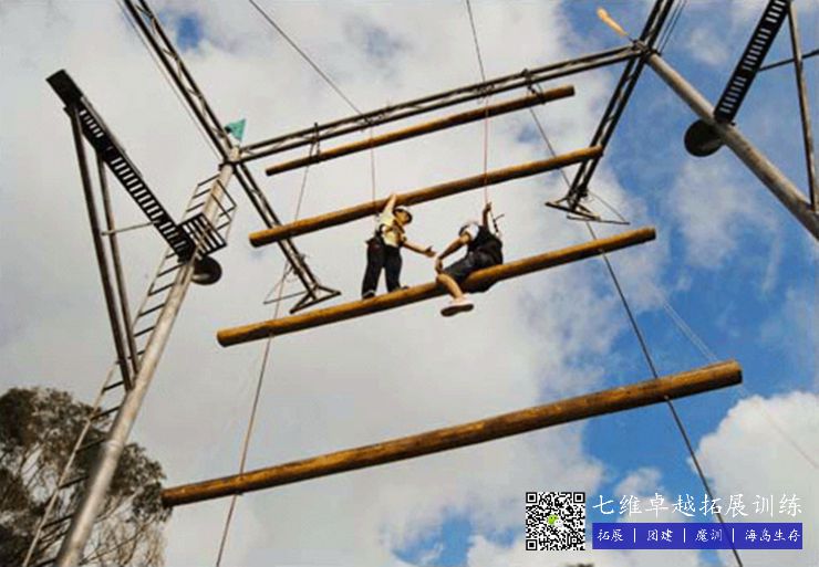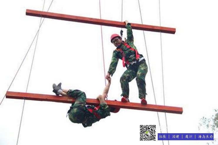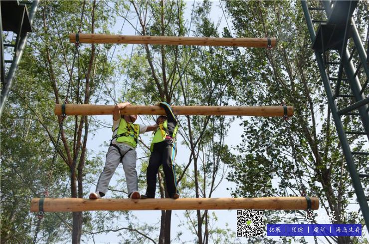 在高8米的天梯上,每根柱子之間距離1.4米,全部隊員穿好安全裝備,通過團體合作合力(lì)往(wǎng)上爬,隻要(yào)當所有的隊員都踩在第五根木頭上,手扶(fú)著第六根木頭的時候就算挑戰成功。