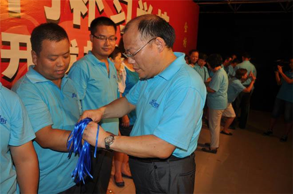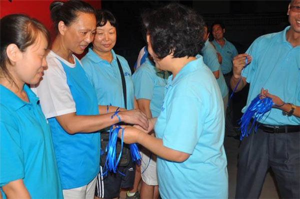 現在請我們所有的夥伴互相走動走來,把你握在手中的藍絲帶獻給你(nǐ)的朋友,你的同事,你的領導,伴隨著這首歌—把愛傳出去