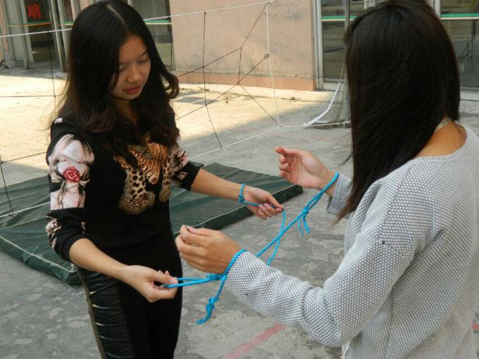 挑戰目(mù)標:挑戰成員不能解開自己手上的繩子,而是隻(zhī)能展開交叉的細繩,使其變(biàn)成兩根獨立(lì)的繩(shéng)子;