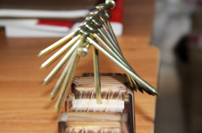 挑戰目標:把一根釘子倒立過來,插(chā)進紙杯底座一部分,而釘帽需得承載剩下的14根釘子,10秒內釘子不可(kě)以倒下,則項目挑戰成功。